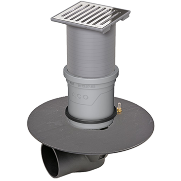 ACO TotalFlow gully set 149x149mm polypropylene gully top with stainless steel grating to load class K3 with bonding flange horizontal outlet for tiled resin or concrete floors. With top extension kit