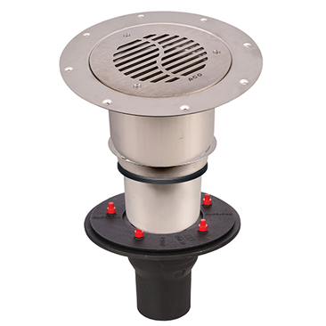 ACO TotalFlow gully set 157mm dia. stainless steel grating to load class L15 with clamping flange vertical outlet for vinyl floors. With fire protection kit with plastic extension kit